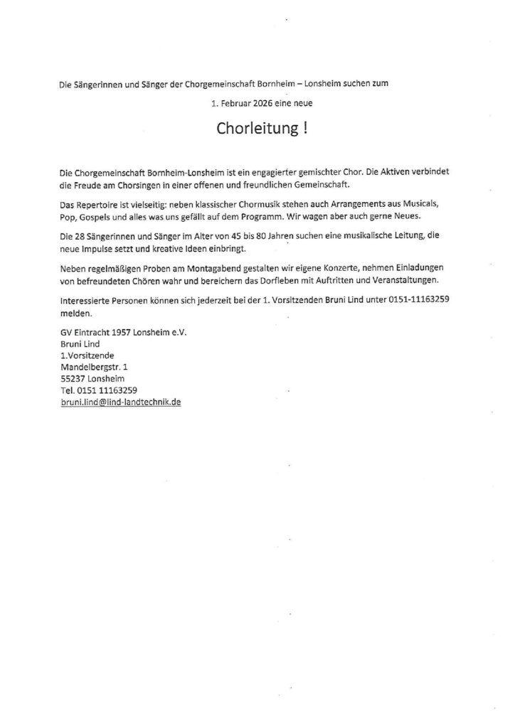 Herr Rudolf Brenner aus Eisenberg sucht im KCV Alzey einen Chor den er leiten kann. Seine Honorarvorstellungen liegen bei ca. 300 Euro
